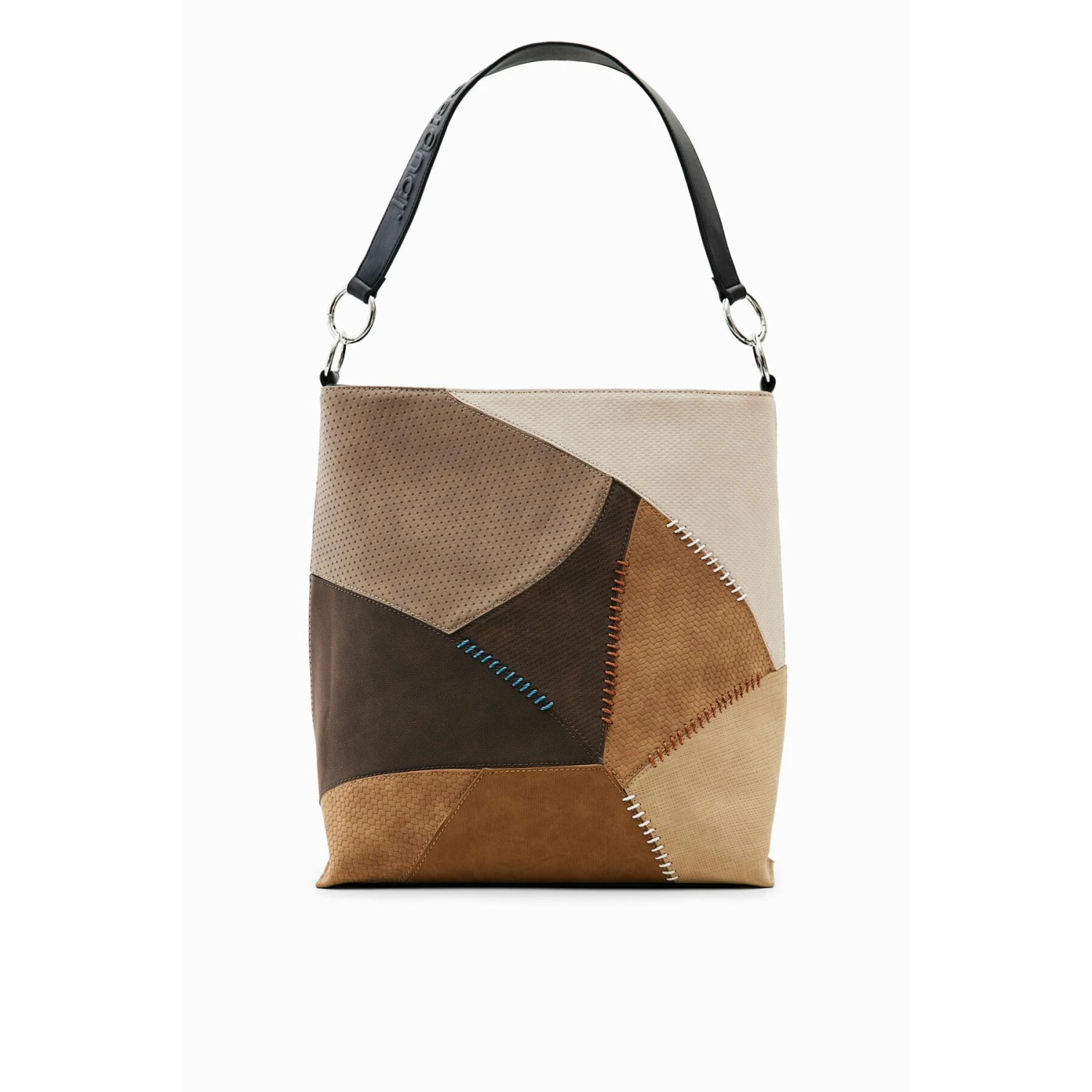 - Deze grote schoudertas heeft een patchwork van kunstlederen texturen met stiksels. Lichtgewicht en zeer veelzijdig, het heeft 3 handvatten en houdt een potloodetui vast.