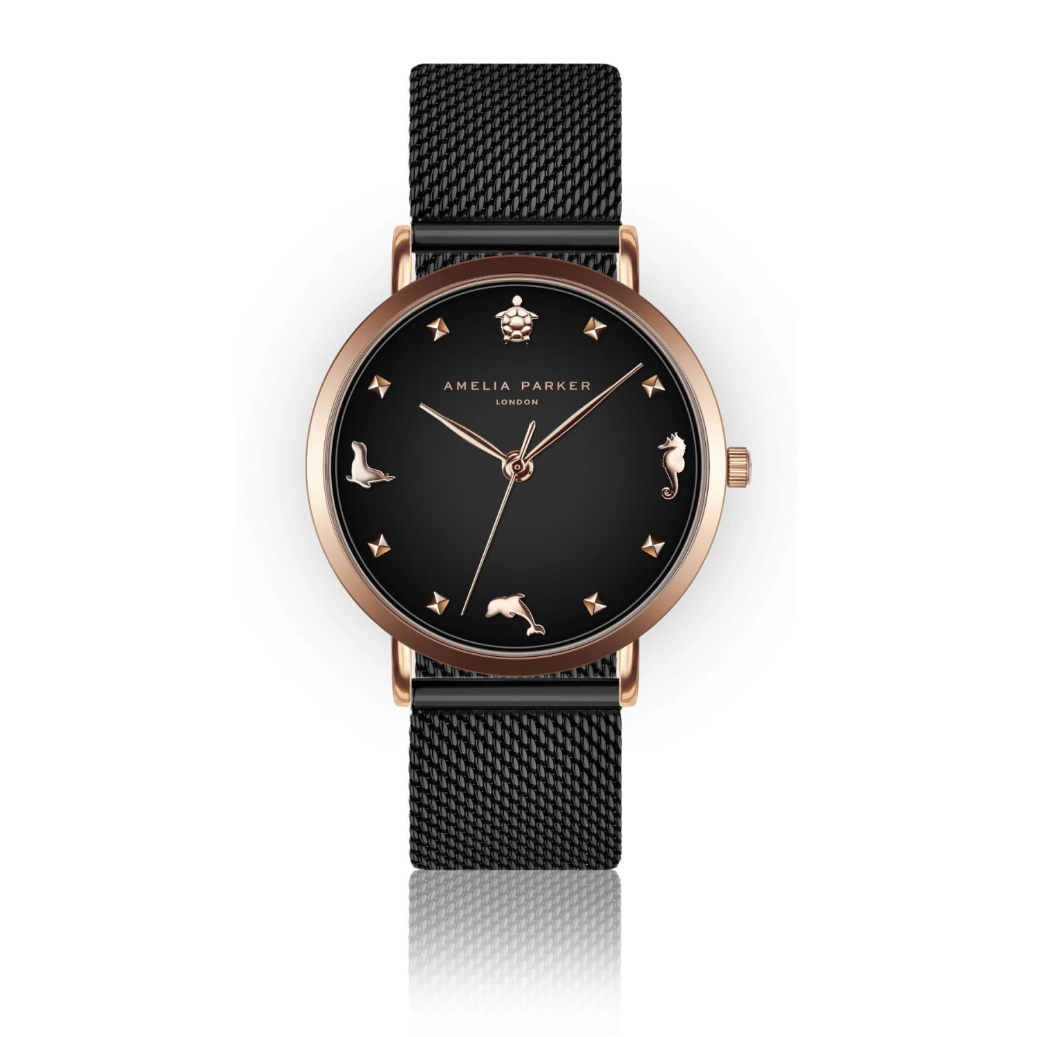 Geïnspireerd door de oude bedelarmband, een symbool van geloof en bondgenootschap, viert dit exclusieve uurwerk de beschermende krachten van de natuur. tortue Voorzien van een gouden zeepaardje, dolfijn en zeehond finis met de hand, evenals Amelia Parker ‘s kenmerkende zeejuweel op een gitzwarte wijzerplaat, maken de contrasterende kleuren een onverschrokken statement.