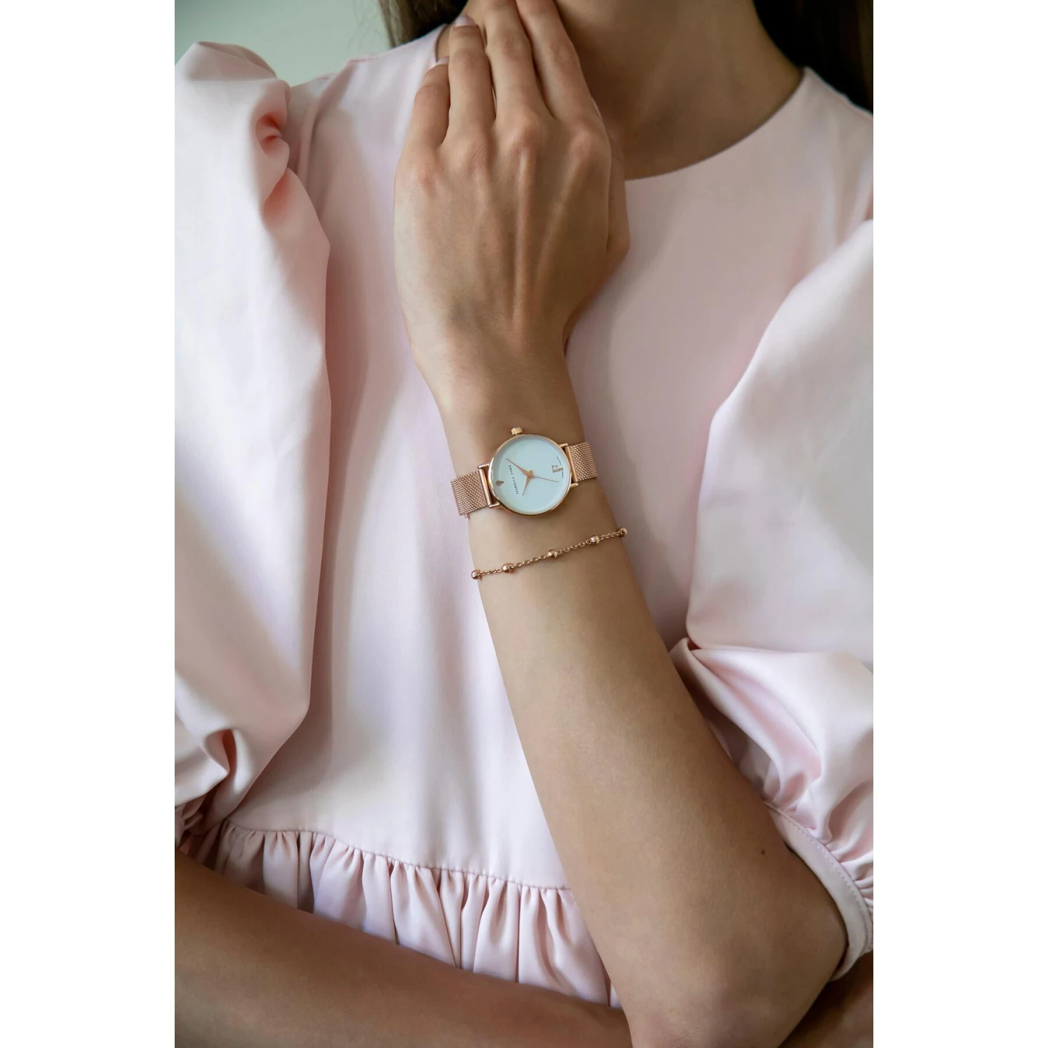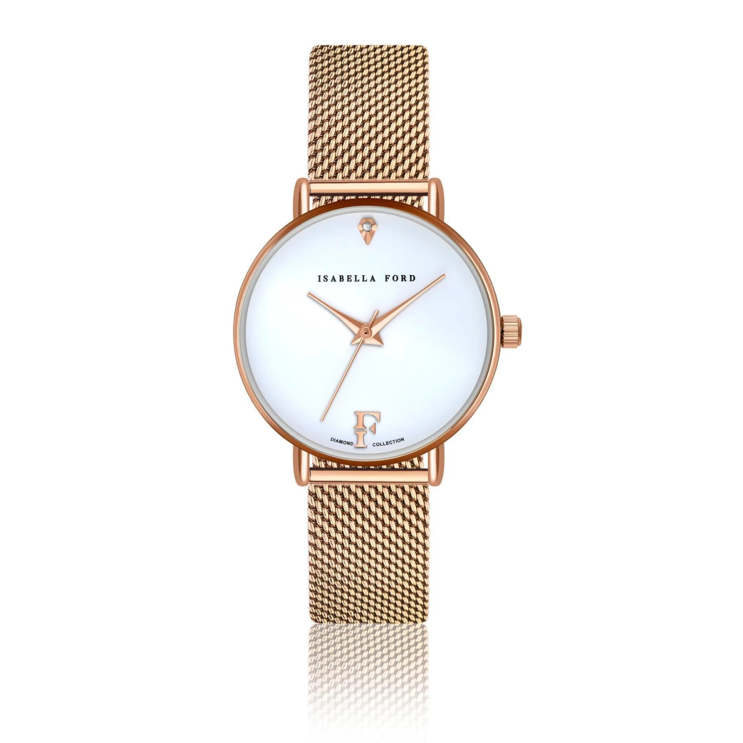 Een boeiend luxe uurwerk Isabella Ford dat moderne en ultra-minimalistische elegantie uitstraalt. Met twee ultra-dunne gouden wijzers rose op een zuivere witte wijzerplaat, staat een enkele echte diamant centraal op het twaalfde uur. Dit uurwerk is ontworpen voor vrouwen die een zijdeachtige eenvoud willen toevoegen aan hun look.