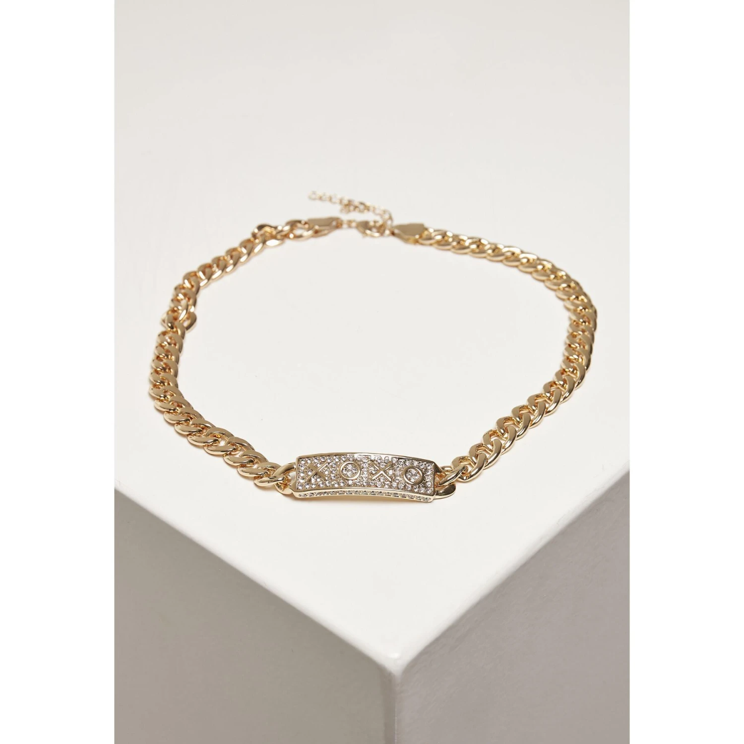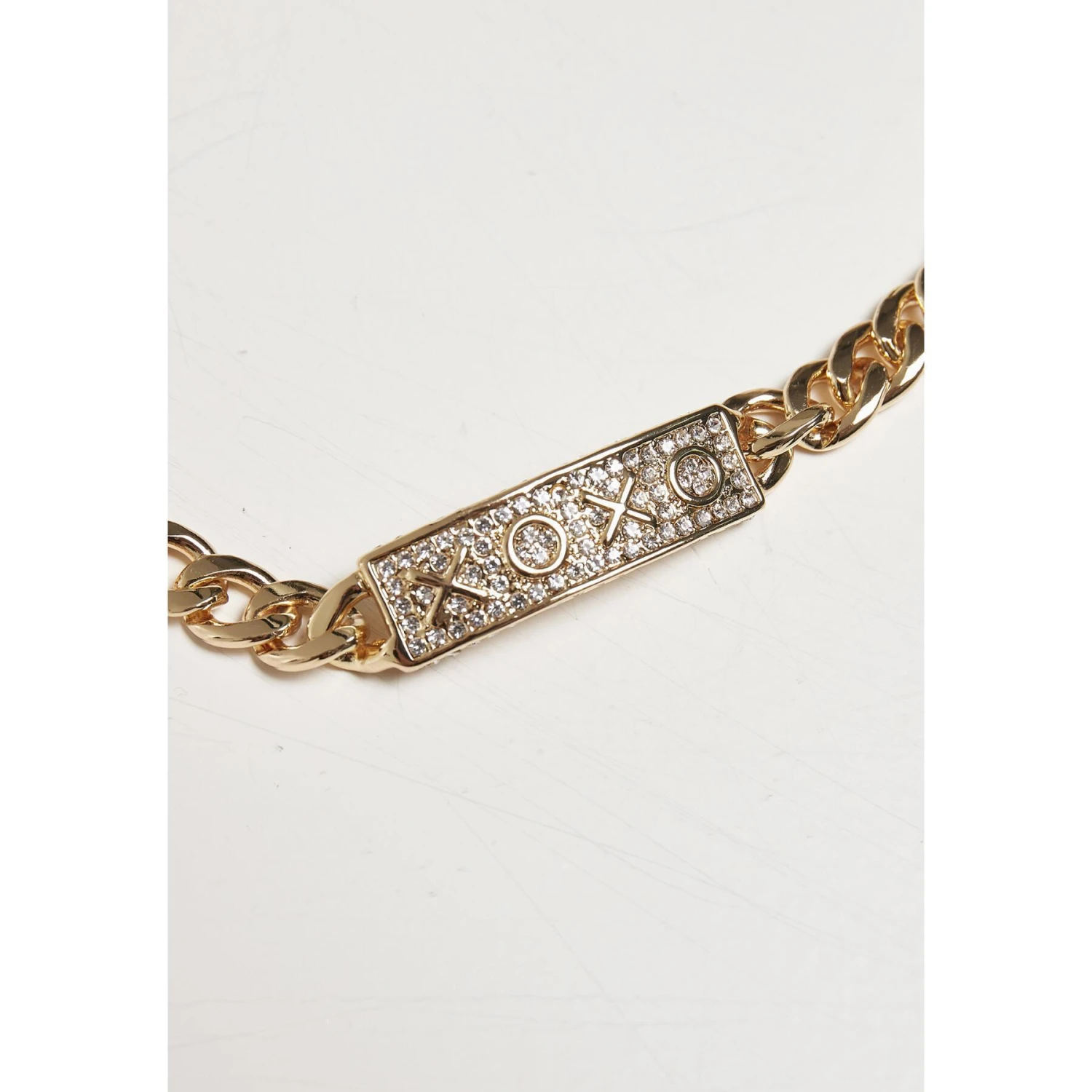 Een schitterend stedelijk accessoire voor casual verschijningen: de ketting Urban Classics bestaat uit grote, platte schakels met lussen die naar een amulet XOXO lopen dat aan het onderste uiteinde is bevestigd. De hanger heeft ontelbare strassteentjes en is een onmiddellijke blikvanger. Dankzij een kleinere sluitketting is de ketting ook in maat verstelbaar. Stof1: 70% ijzer 30% zinklegering