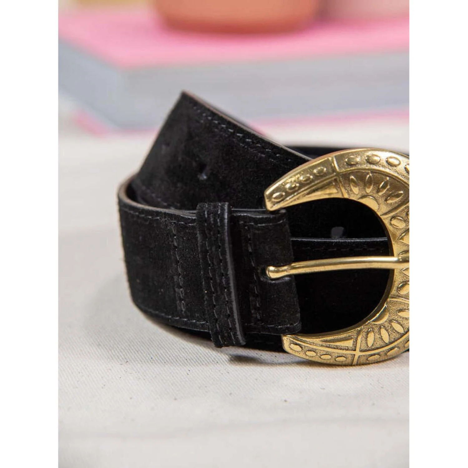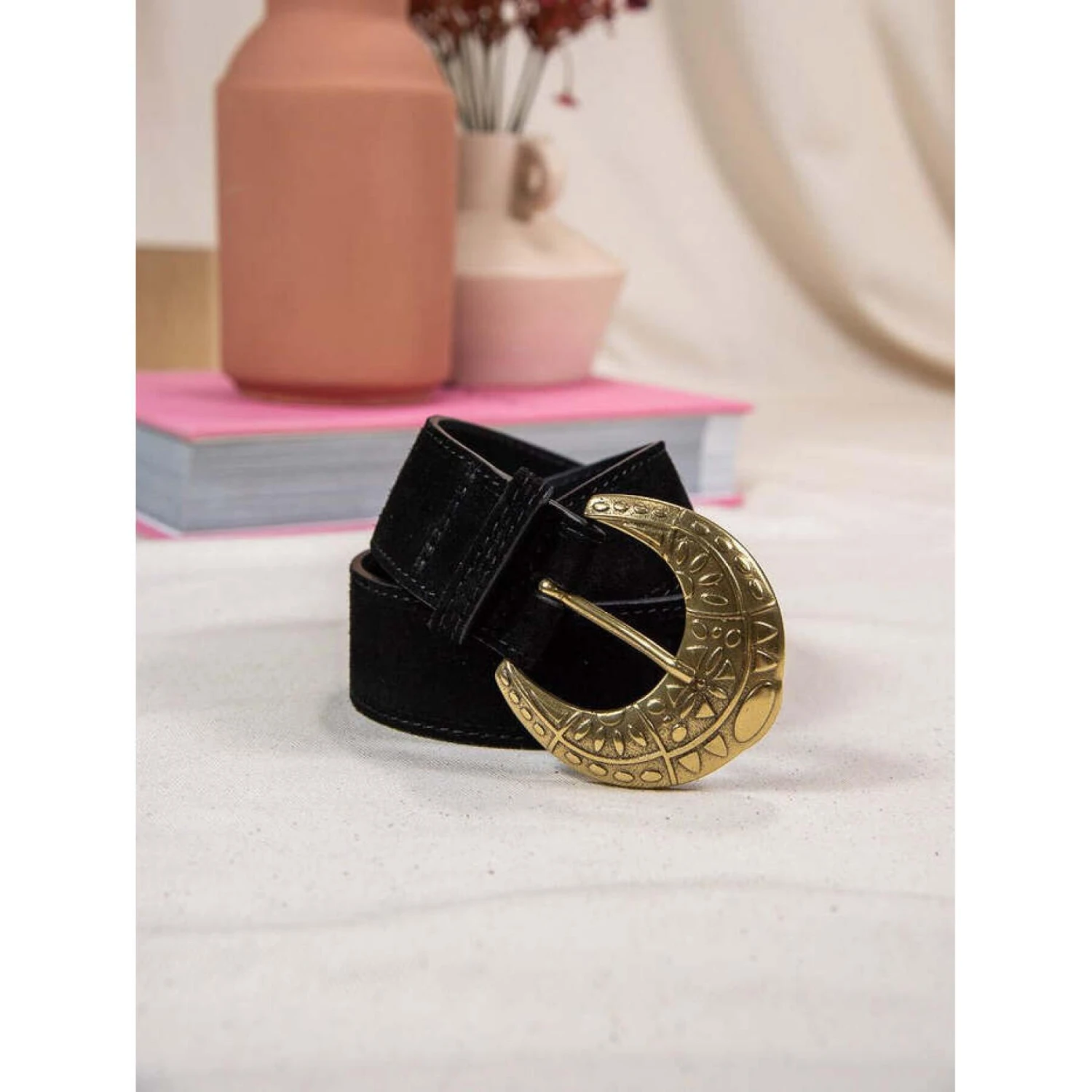 Deze IDONA riem van La Petite Etoile is zowel elegant als verfijnd. De zwarte kleur geeft hem een klassieke look die gemakkelijk te combineren is met je garderobe. Het strakke ontwerp wordt versterkt door een ovale gouden gesp die een vleugje originaliteit toevoegt. De riem is ongeveer 3 centimeter breed, zodat hij bij al je broeken en rokken past. Het leer voelt glad en zacht aan, waardoor het comfortabel is om te dragen. Hij wordt geleverd in een mooie doos van het merk.