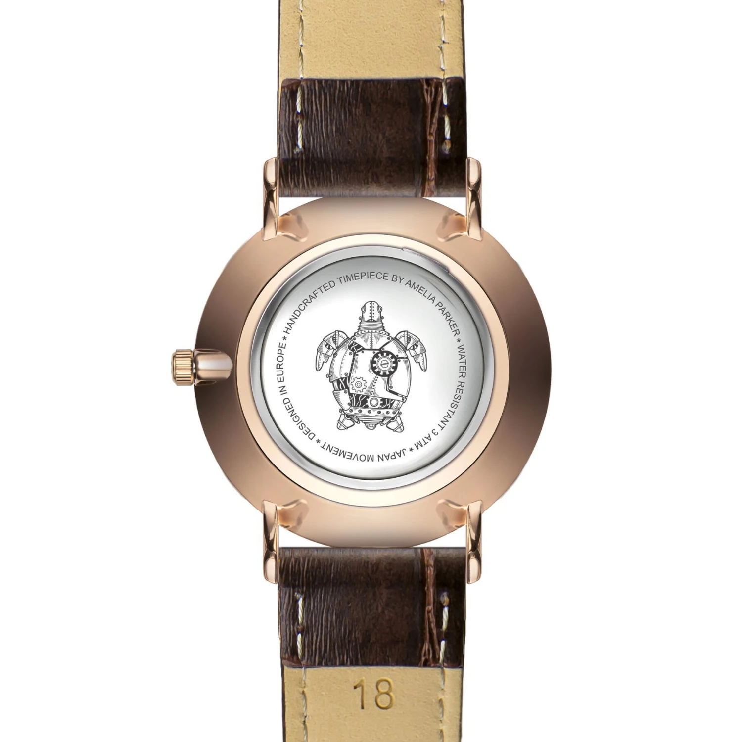 Met de klassieke combinatie van gouden Romeinse cijfers rose op een gestructureerde crème achtergrond en geaccentueerd door het iconische tortue zeejuweel Amelia Parker op de secondewijzer, voor Amelia Parker, viert dit horloge tijdloze charme.