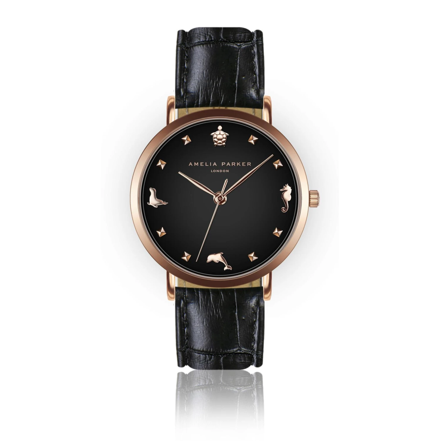 Geïnspireerd door de oude bedelarmband, een symbool van geloof en verbond, viert dit exclusieve uurwerk de beschermende krachten van de natuur. tortue Voorzien van een gouden zeepaardje, dolfijn en zeehond finis met de hand, evenals Amelia Parker ‘s kenmerkende zeejuweel op een gitzwarte wijzerplaat, maken de contrasterende kleuren een onverschrokken statement.