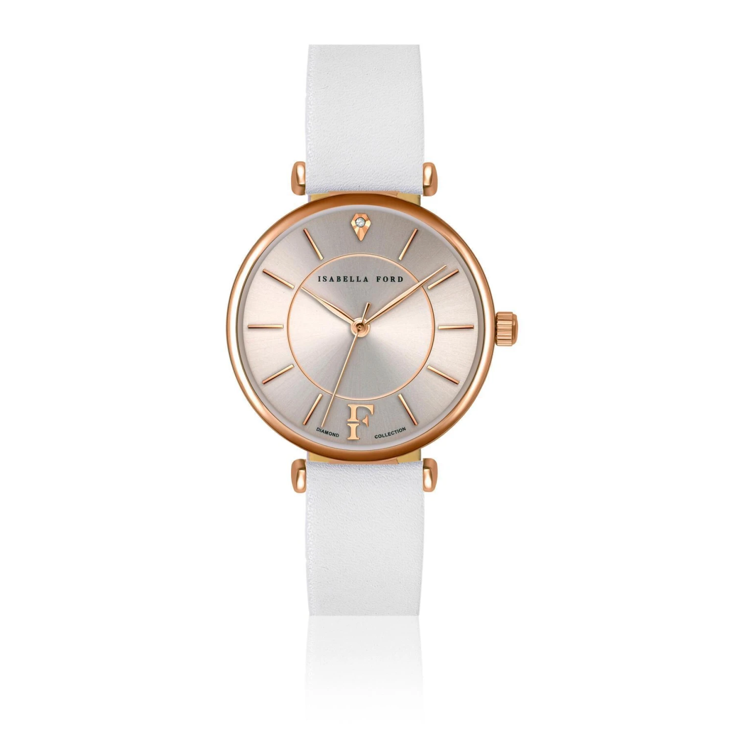 Volledig gemaakt van goud rose, is dit luxe uurwerkIsabella Ford ‘s eerbetoon aan onberispelijke stijl en verfijnde functionaliteit. Het is opgedragen aan vrouwen die superieur design herkennen als ze het zien. Met minimalistische, ultradunne uurmarkeringen en wijzers, en een onmiddellijk herkenbaar reliëf F-insigne Isabella Ford, allemaal in gedempt rose goud, een prachtige met de hand aangebrachte echte diamant schittert op het middernachtelijk uur.