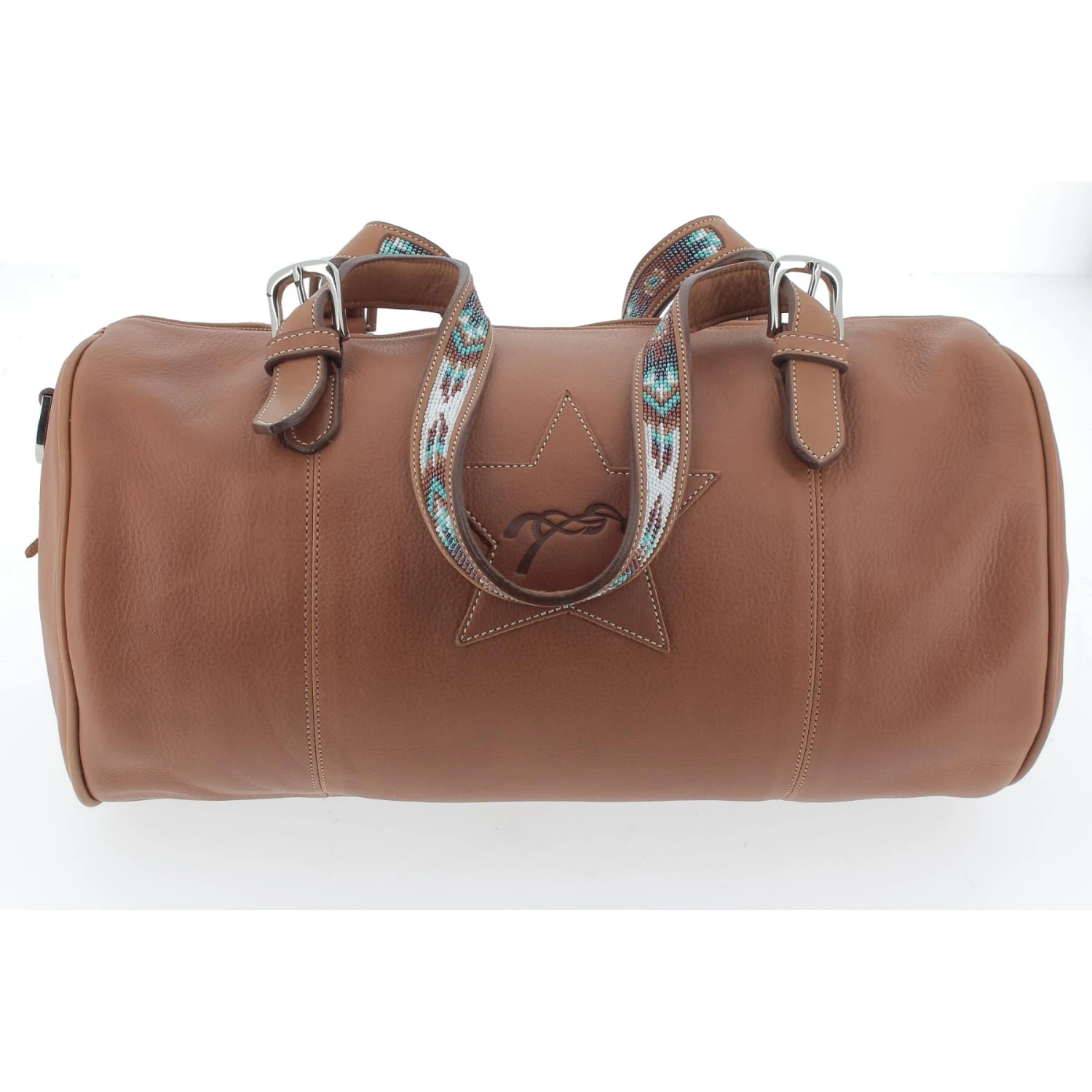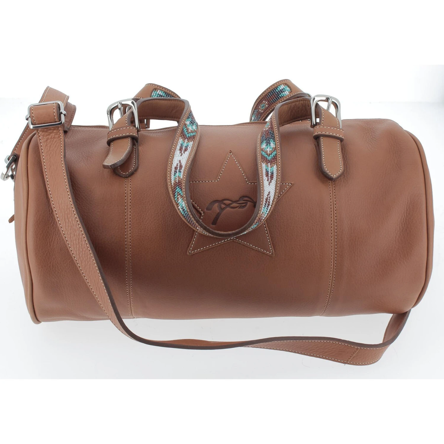 Handtas of klein bagagestuk “Bowl” Pénélope bowlingvorm in eersteklas leder. Hij heeft twee handvatten die versierd zijn met een rij veelkleurige parels in turkooizen tinten op het cognac model en met het Pénélope logo-ontwerp op het zwarte model. In het midden zit een stervormig leren inzetstuk met het Pénélope logo in reliëf erop. De tas heeft ook een schouderriem die kan worden vastgemaakt en losgemaakt met twee zilveren karabijnhaken. De tas sluit met een zilverkleurige rits aan de bovenkant. Binnenin zit een crèmekleurige voering en een vakje met rits.