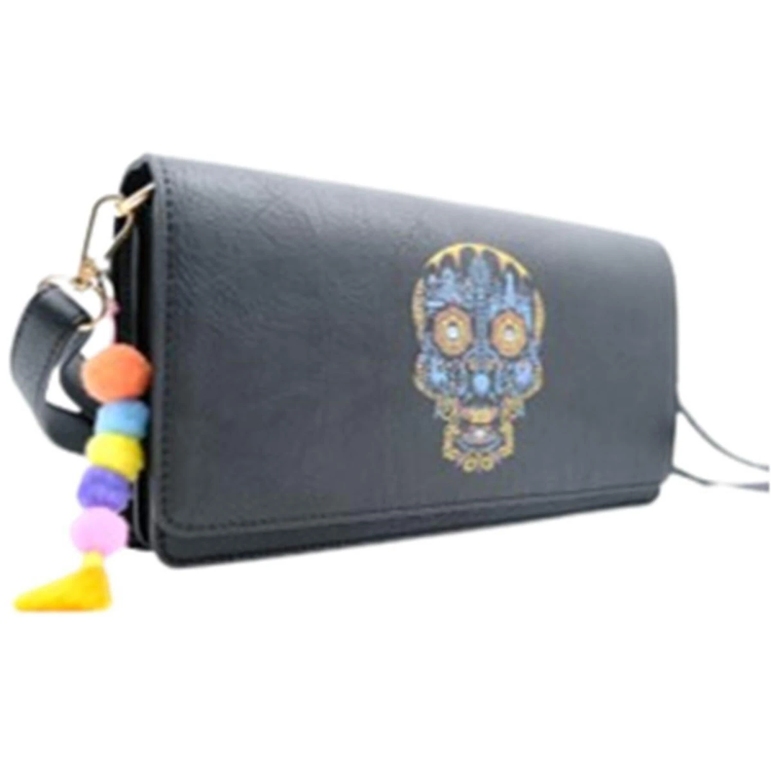 De zwarte toverstaftas van kunstleer Disney Fashion Gaming is perfect om bijvoorbeeld de Nintendo Switch in mee te nemen en die met is voorzien van de film Coco met een schedel en gekruiste botten geïnspireerd op de traditie van het Dodenfestival op Mexique.