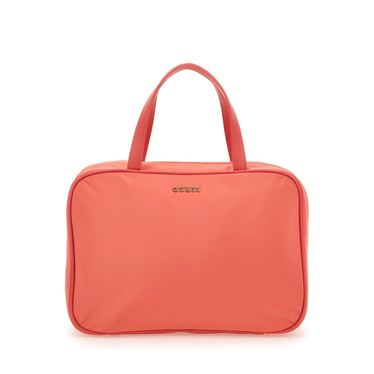 Logo: ” GUESS ” op voorkant make-up tas, ” GUESS ” gegraveerd op ritstrekkers, ” GUESS ” op voering