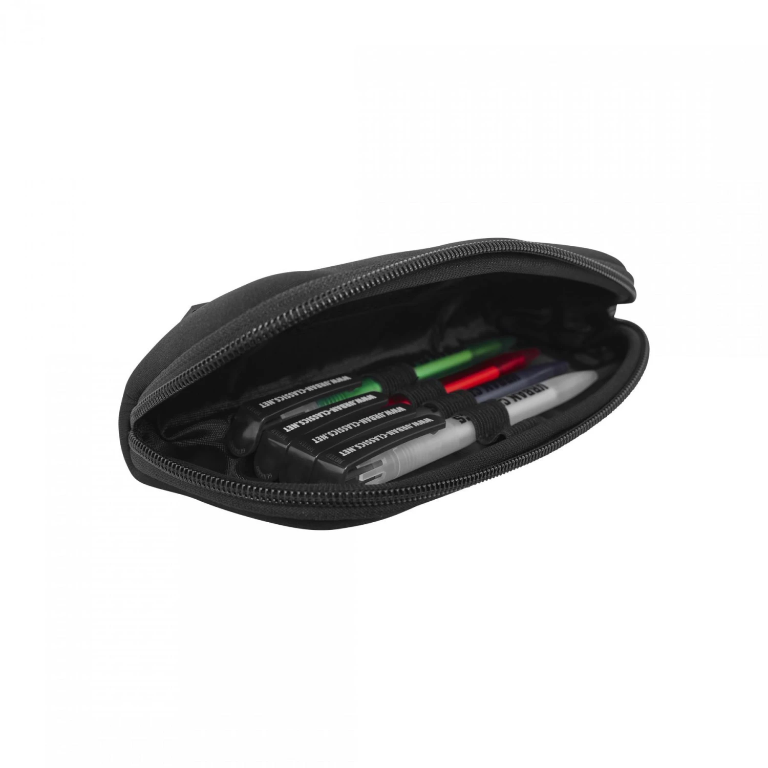 De ouderwetse pennenetui heeft een chique make-over gekregen en is nu een zachte, flexibele neopreen pennenetui met een ritssluiting die ver gaat. Binnenin houden penlussen en een zakje alles georganiseerd, terwijl aan de buitenkant het logopatch de look compleet maakt.