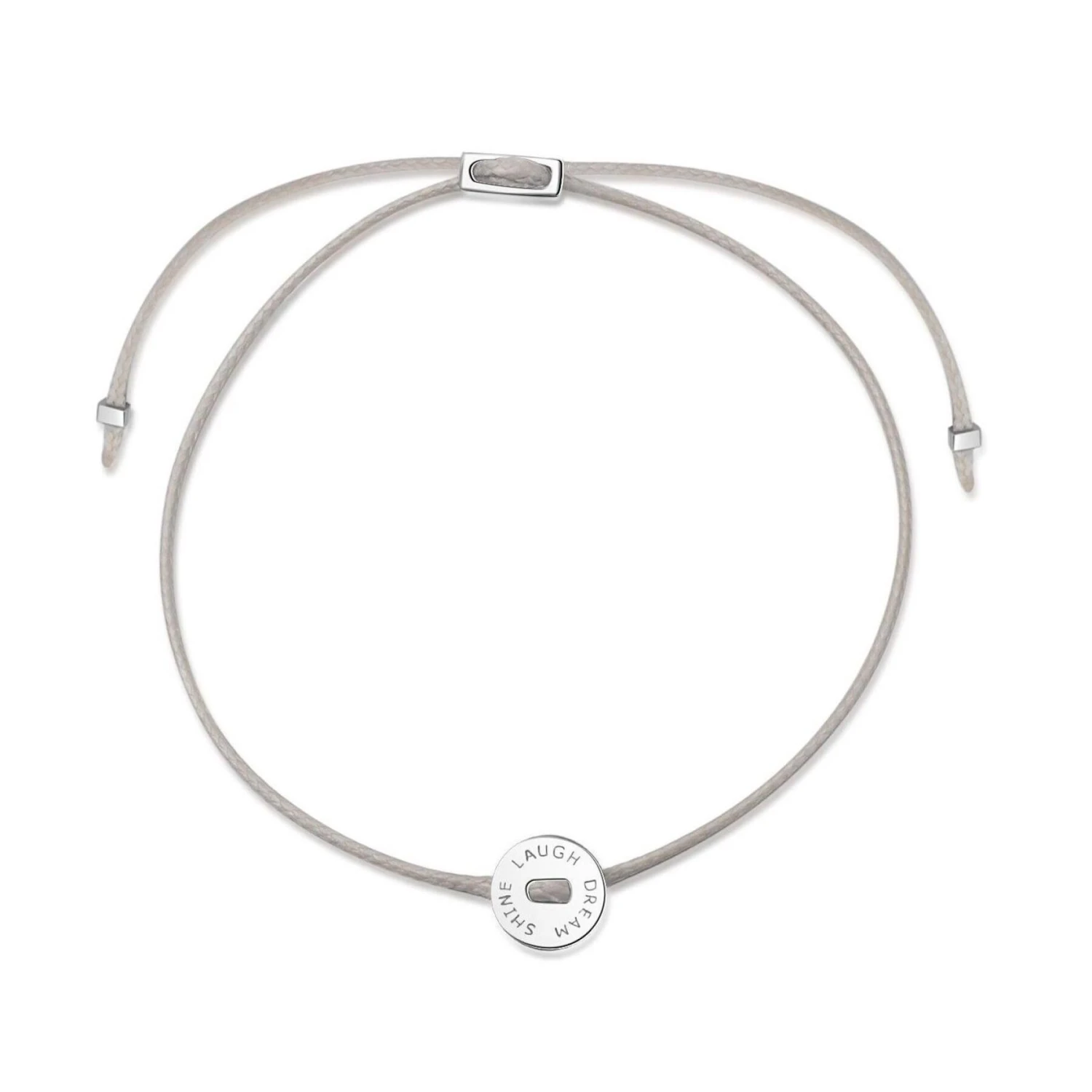 De slanke, verstelbare textielarmband is voorzien van een ronde bedel met de boodschap “LAUGH SHINE DREAM”!