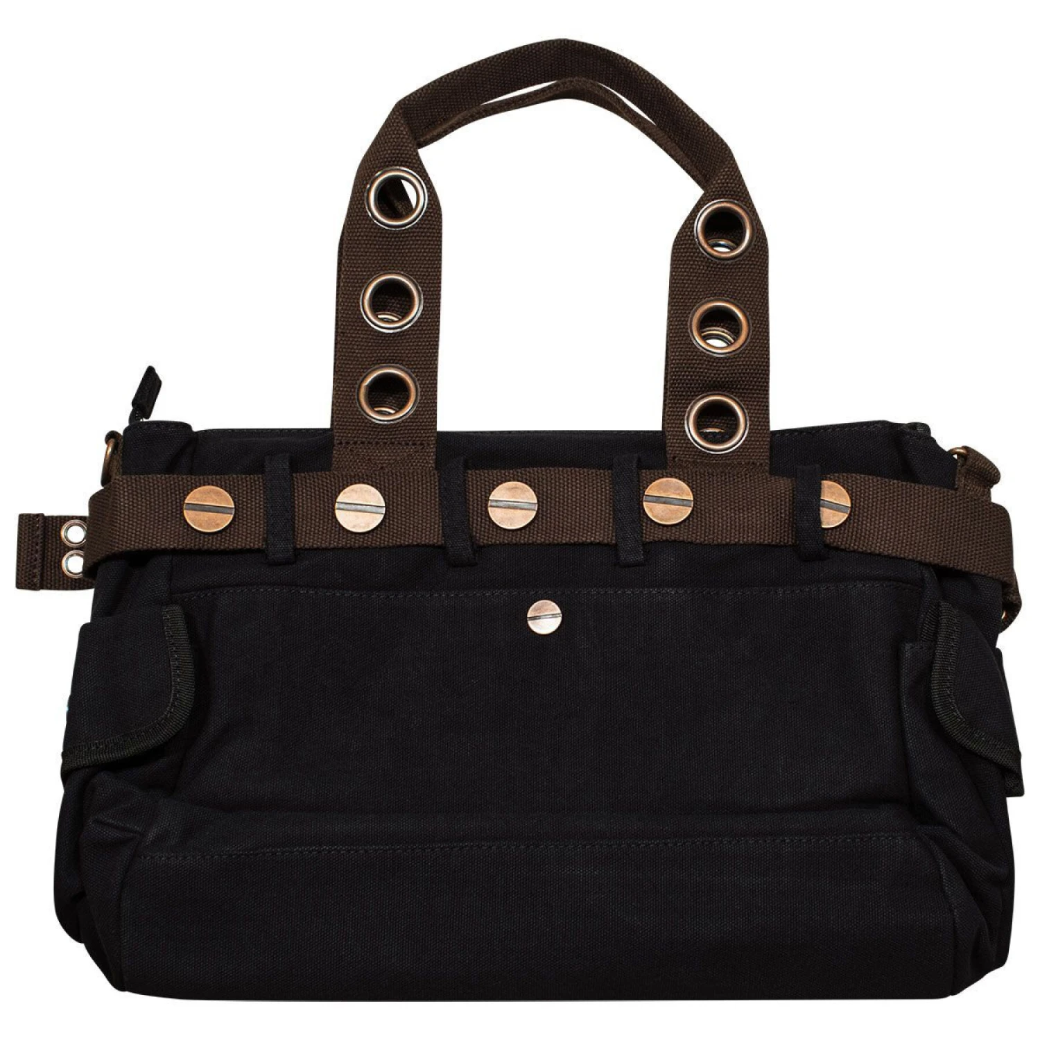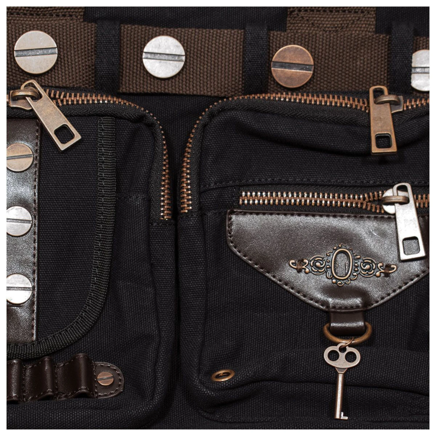 – Grote handtas op Look die tegelijk Steampunk is en doet denken aan een Messenger Bag
