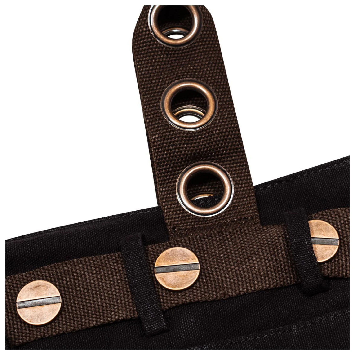 – Versierd met meerdere verkoperde schroefkoppen op een bruine riemachtige band