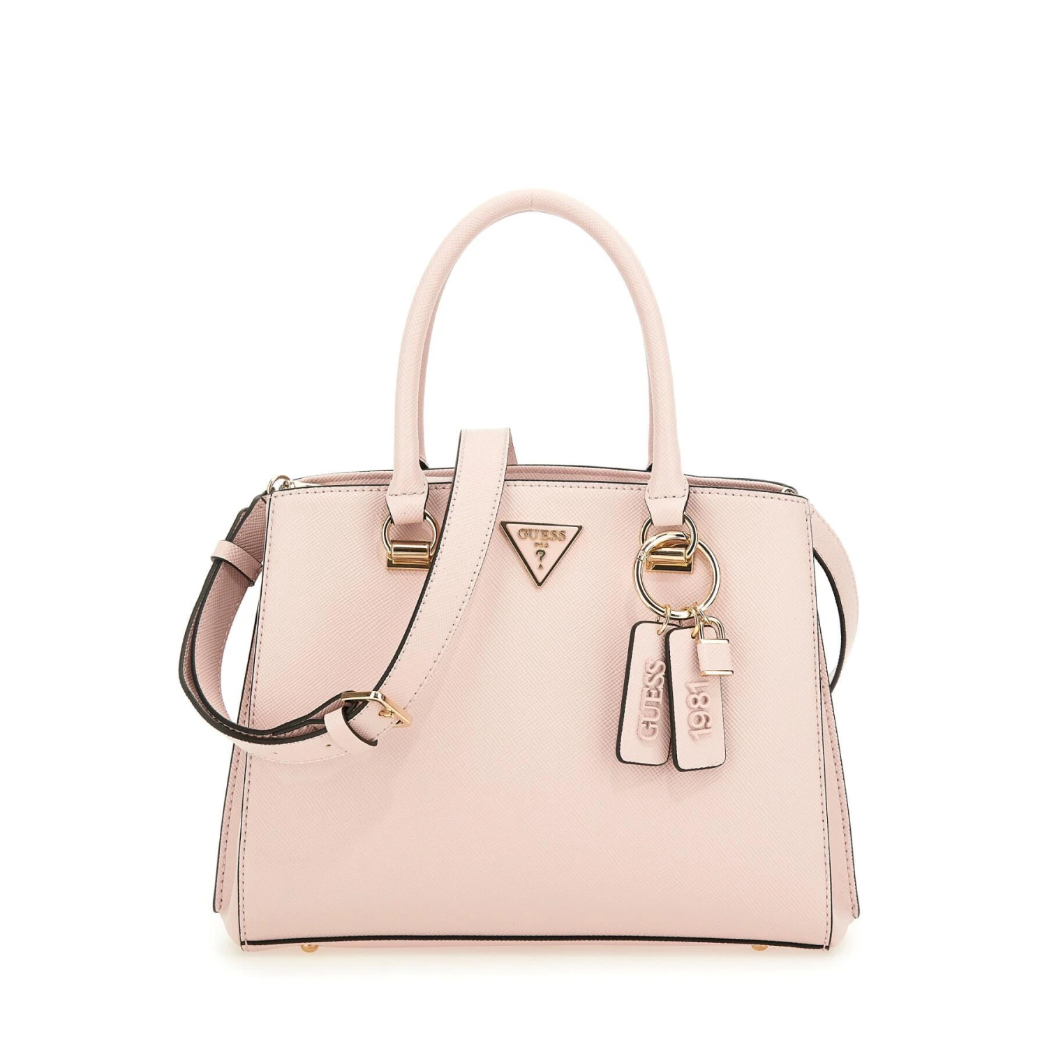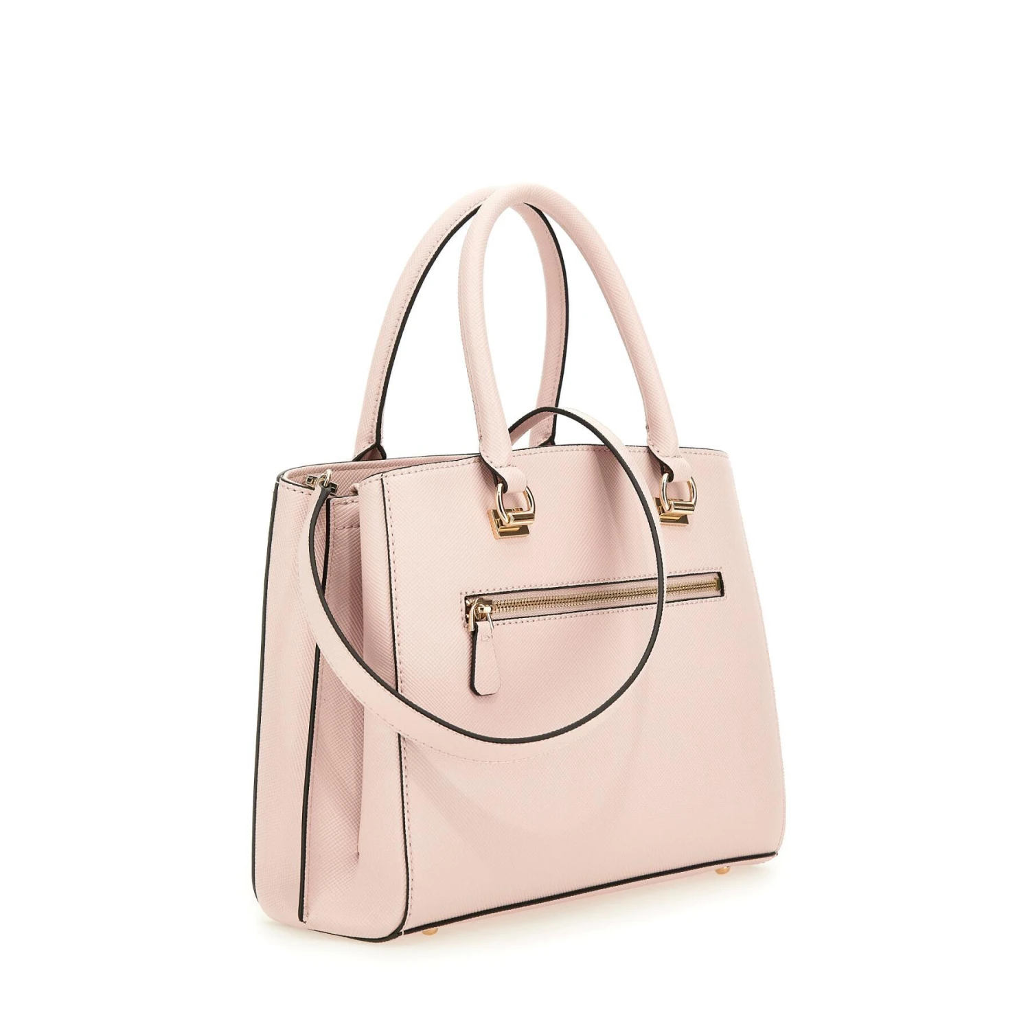 Omschrijving Code# HWZG7879060 Kunstlederen buitenkant. Ritssluiting. Gekleurde of lichte metalen onderdelen. Saffiano afwerking. Bedel met logo op basis van handvat. Driehoekig logo op de voorkant.