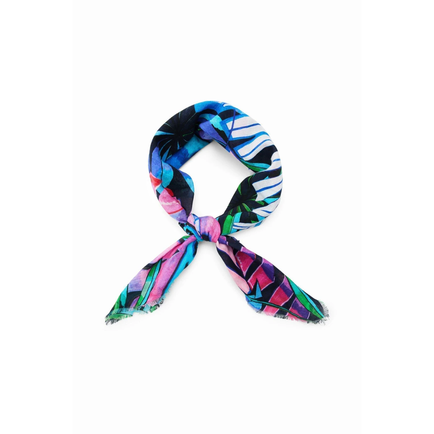 Vierkante sjaal met tropische print en gerafelde uiteinden.
