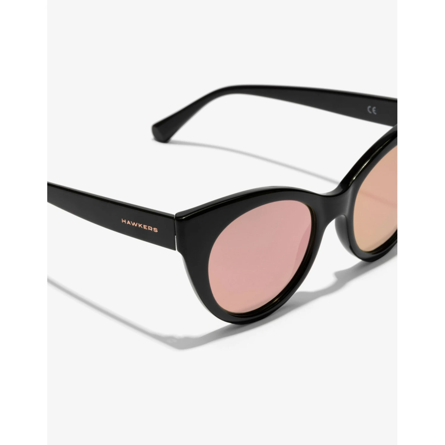 Deze ronde zonnebril vintage is een nostalgische herinterpretatie van het klassieke cat-eye montuur. Het zwarte ontwerp met uitgesproken glanzende uiteinden en rose gouden glazen met benadrukt de vrouwelijke lijnen.